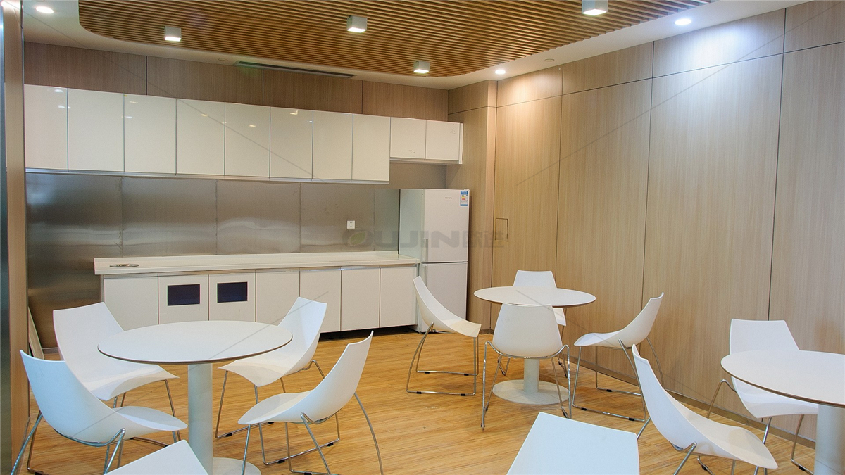 茶水間的宗旨是為創(chuàng)意人士提供一個(gè)創(chuàng)意及休息的工作平臺(tái),而非我們通常所熟知的辦公類型。旁邊定制了茶水臺(tái)及茶水吊柜。在一個(gè)獨(dú)特的空間里混合布局了公共休閑空間與休息的區(qū)域。休閑茶水區(qū)配有冰箱、咖啡機(jī)、微波爐的廚房設(shè)施、以及精美的小零食點(diǎn)心之類食品。充分體現(xiàn)了公司對(duì)員工的人文關(guān)懷,處處為員工著想的企業(yè)文化。